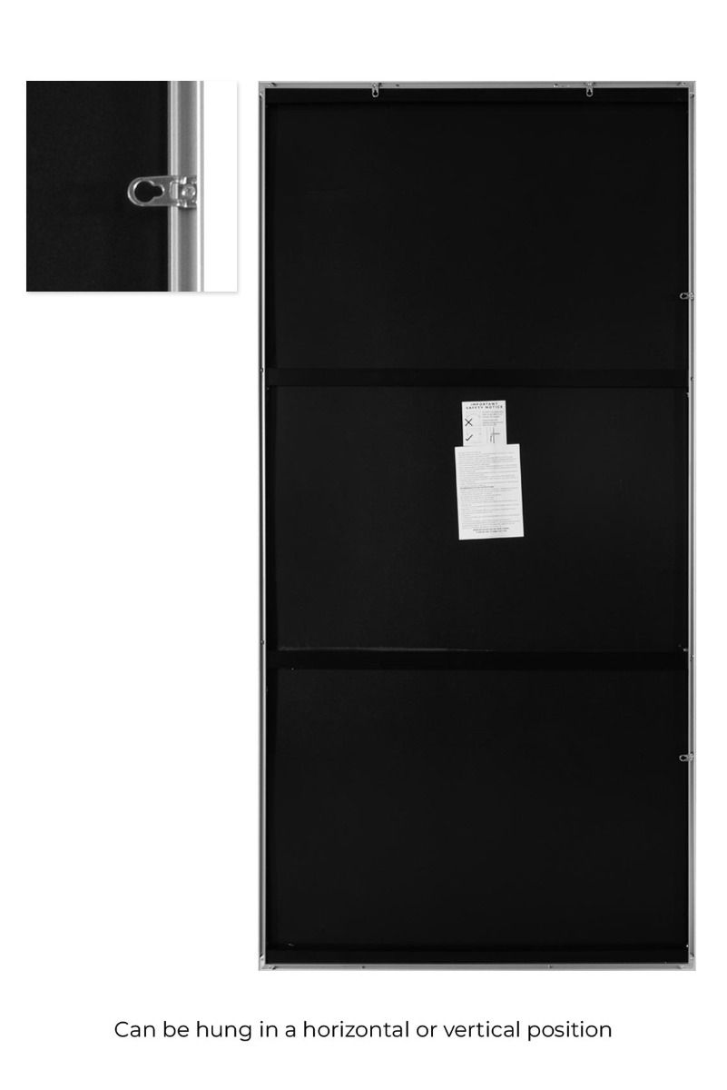 The mirror comes equipped with 4 manufacturer-fitted fixings on the back of the frame, allowing for easy mounting in both landscape and portrait orientations. To install, hang the mirror directly from screws in the wall, ensuring the screws are positioned equidistant from the center of the fixings. DO NOT use string for mounting.