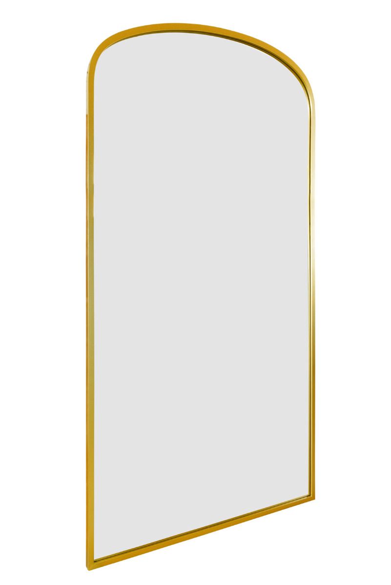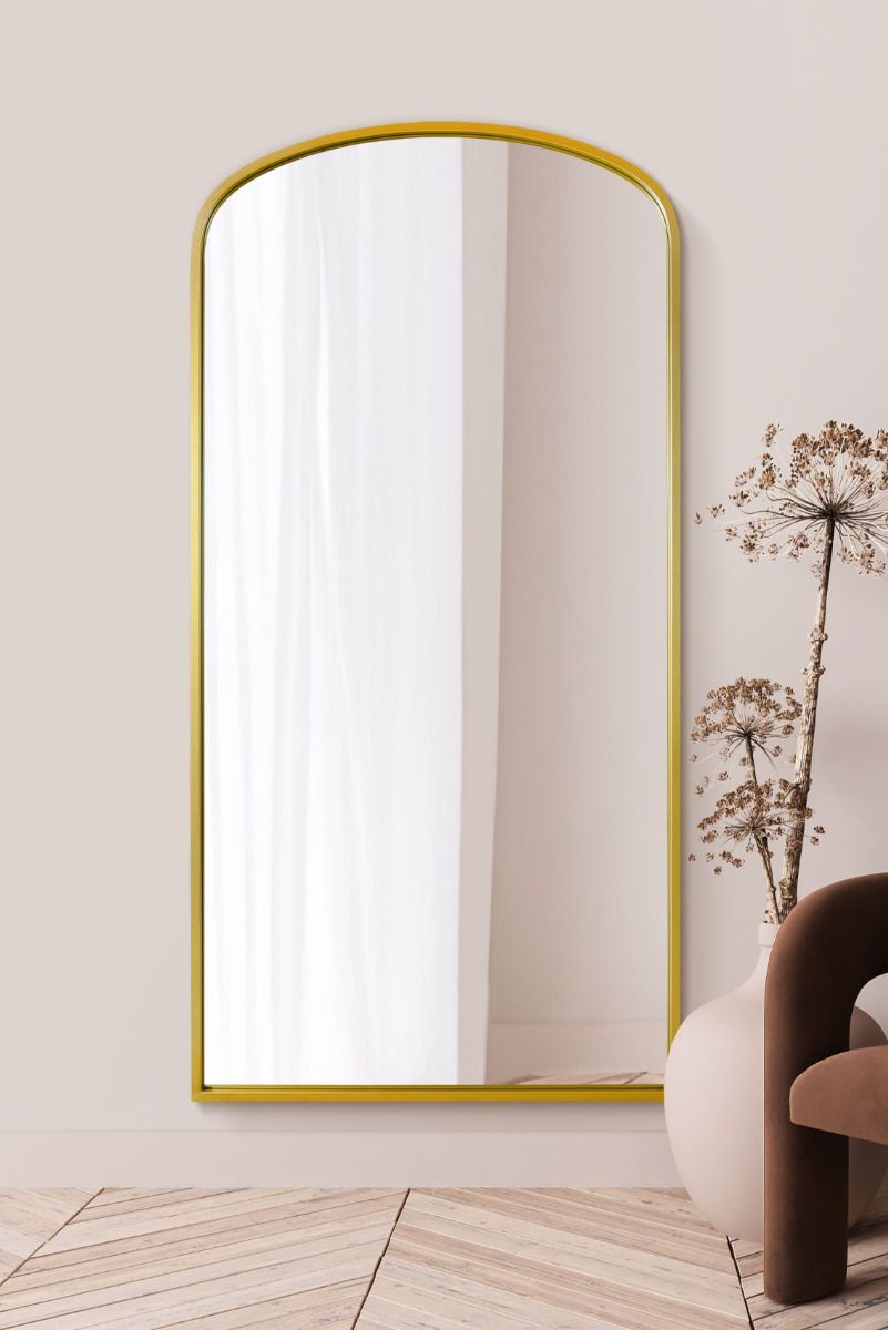 Discover the elegance of our new mirror range featuring a luxurious gold metal shallow arched frame fitted with premium mirror glass and a waterproof backing. This versatile mirror is designed for both wall hanging and freestanding use as a leaner, equipped with keyhole-style welded fixings for effortless installation. Its sleek design ensures the mirror sits flush against the wall for a modern aesthetic. Crafted from the finest materials, this substantial mirror weighs approximately 20kg and measures 79" x 39" (200cm x 100cm), with a frame that is 2cm wide at the face and 3cm deep. For secure installation, ensure to use appropriate wall fixings suitable for your wall type, making it an ideal choice to enhance any space with its contemporary style.