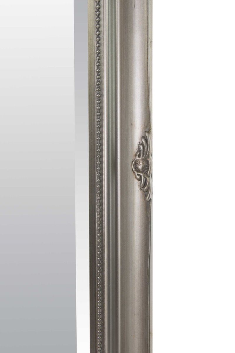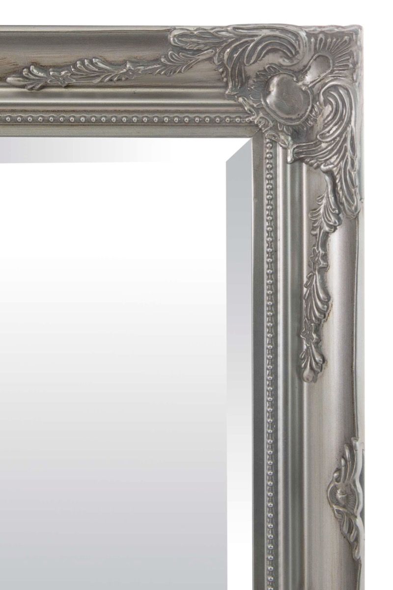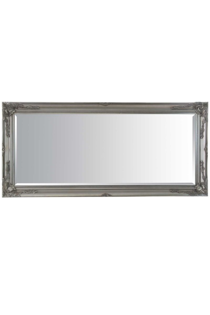 Here we have a large 4inch classic ornate full length silver wall mirror. The designs boasts ornate detailing in all four corners and sides. The mirror glass itself comes bevelled. This mirror has a glass size of 5ft x 2ft 152cm x 61cm and has an overall size of 5ft7 x 2ftt7 170cm x 79cm. We stock this frame in 5 different colours white black gold silver and ivory and 5 different sizes.