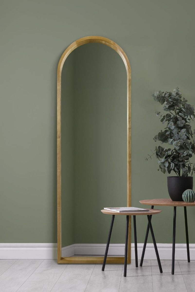 Introducing a sophisticated addition to your home decor, the new mirror range features a solid oak frame with an elegant arched design and premium mirror glass. This versatile mirror can be mounted on the wall or used as a leaner for a full-body view, offering both style and functionality. It comes equipped with pre-installed hooks for portrait wall hanging, ensuring a seamless, modern look. The mirror's robust construction weighs around 10kg, making it sturdy and durable. Enhance your order with optional solid wall fixings or plasterboard fixings for secure installation. Overall dimensions are 71" x 24" (180cm x 60cm), with a frame width of 24mm and depth of 48mm.