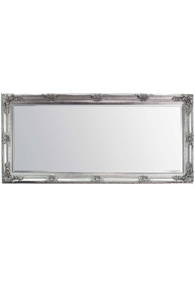 Extravagant 3.5inch framed silver wall mirror adds style to any room from the living room to a hallway. With ornate detailing in all four corners and sides this is a gorgeous piece ideal for any room from bedroom to lounge. This mirror has a glass size of 4ft10 x 2ft 148cm x 61cm and has an overall size of 5ft 5 x 2ft 7 168cm x 78cm.