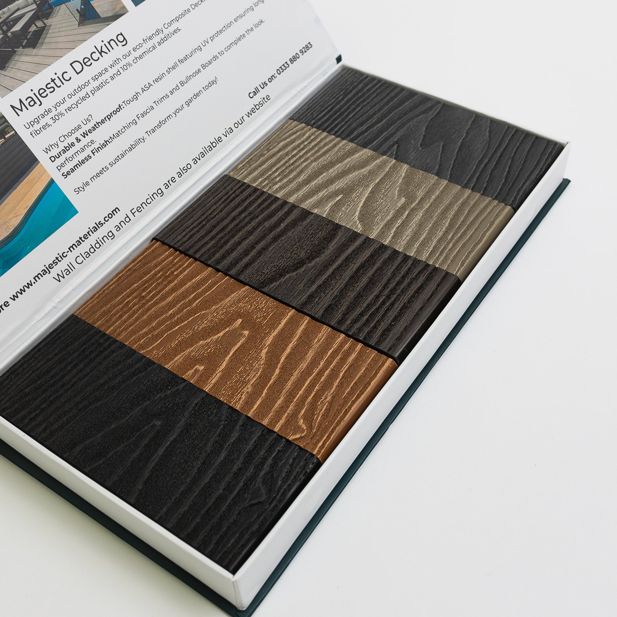 Discover the perfect finish for your next project with Majestic Materials Samples. This curated selection includes samples of composite decking, composite cladding, composite slatted cladding, and acoustic wall panels, helping you make an informed decision with confidence.