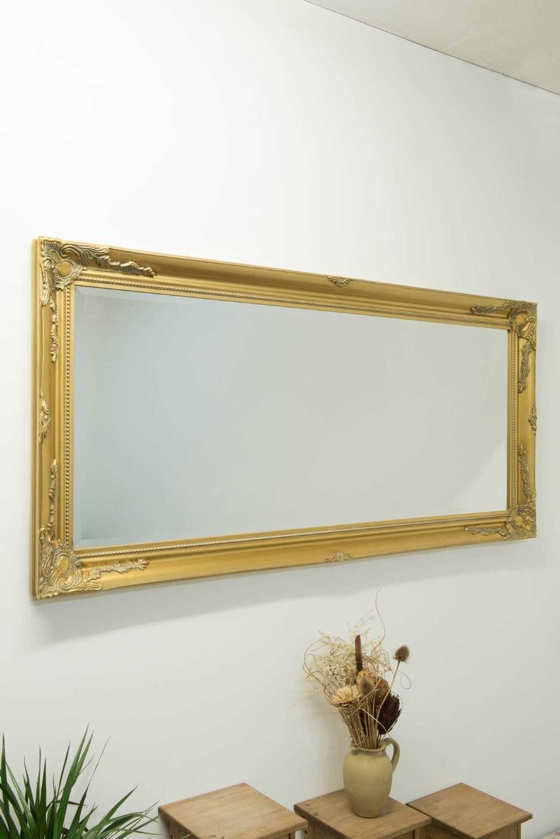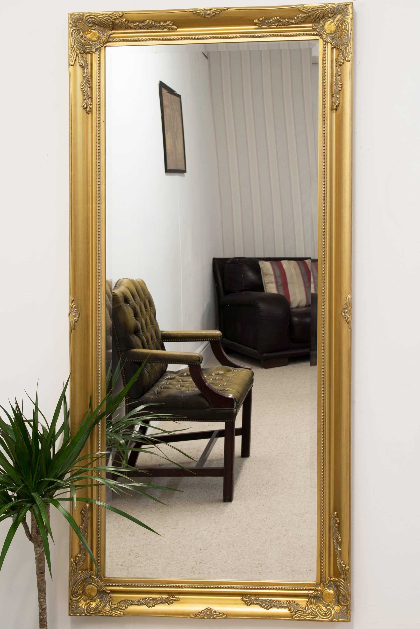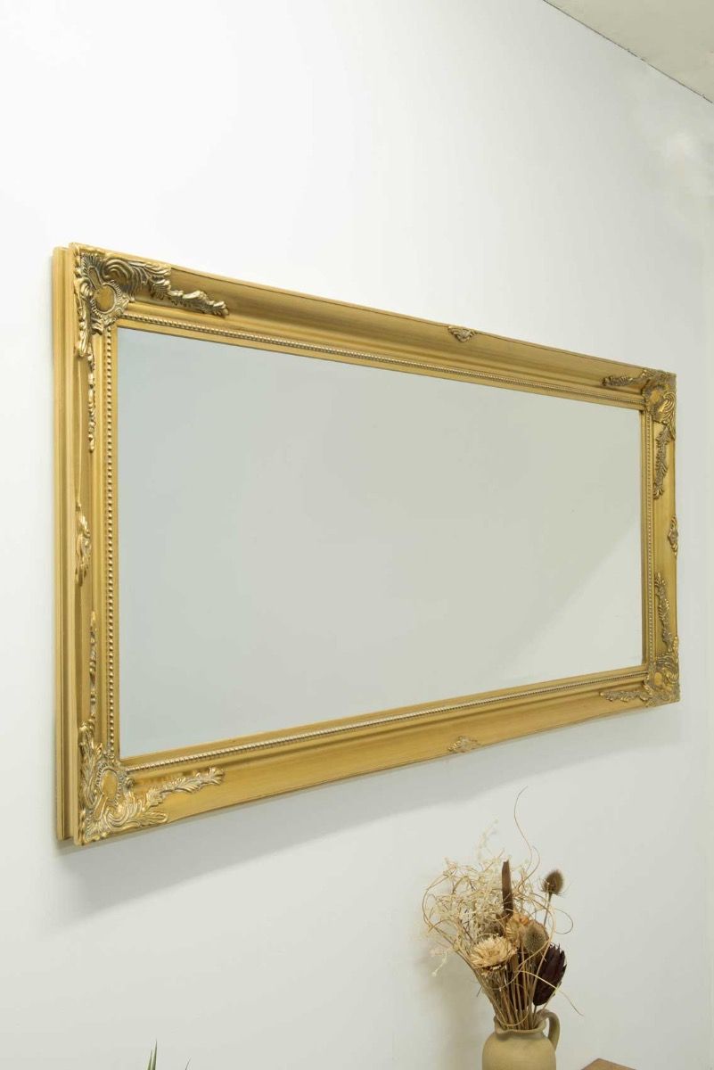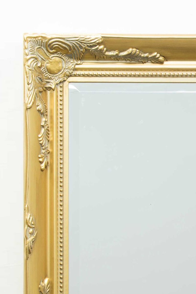 Here we have an extra large classically designed ornate Gold Coloured wall mirror. This mirror has an impressive 4 inch thick frame. The design boasts ornate detailing in all four corners and sides. The mirror glass itself comes bevelled. This mirror has a glass size of 5ft x 2ft 152cm x 61cm and has an overall size of 5ft7 x 2ft7 170cm x 79cm. We stock this frame in 5 different colours white black gold silver and ivory and 5 different sizes.